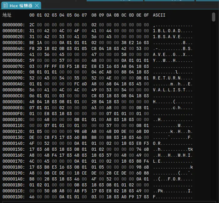 1BLOAD 1BSAVE BREAK ,考虑到HPPPL语言如此高的执行效率,是否使用了某种类似编译的机制呢,为了深入分析,我们使用ImHex来查看: