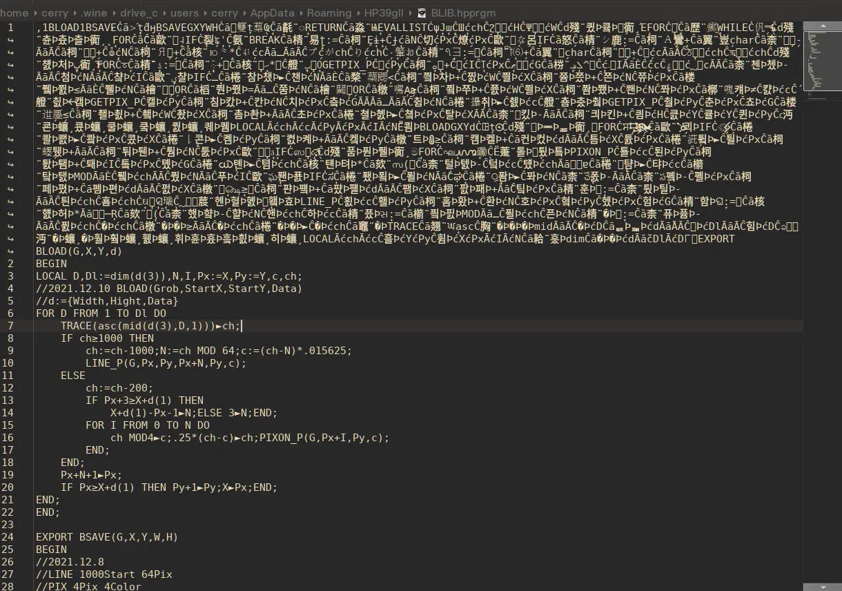 首先以一个程序作为示例,HP39GII程序-图像处理库 BLib,这是一个带简单压缩算法的图像保存和加载库,我们在计算器上编辑好后,按下SHIFT+1【Prgm】之后,可以看到大小10KB,而实际上源码本身只有3KB,那么多出来的那些数据是什么呢?